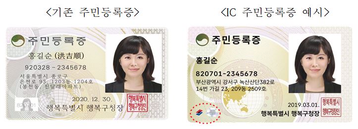 IC주민등록증 발급은 실물 주민등록증을 IC칩이 내장된 주민등록증으로 교체해 준다. IC주민등록증을 휴대전화에 태그해 모바일 주민등록증을 직접 (재)발급 받을 수 있다. QR발급은 QR코드를 통해 모바일 주민등록증을 발급받는 방법으로 신청 즉시 발급받을 수 있으나 휴대전화를 바꿀 경우는 행정복지센터를 다시 방문해 재발급 받아야 한다.