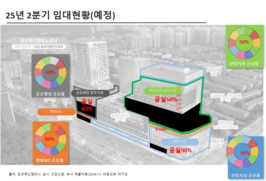 [고양신문] 침체된 원당역 주변 활성화를 목적으로 최근 완공된 국토교통부 도시재생 혁신지구 국가시범지구 사업 ‘창조혁신캠퍼스 성사’(이하 성사혁신지구)의 심각한 공실률 문제가 시의회를 통해 제기됐다. 완공 전 업무시설 및 상업시설 등에 대한 입주계획을 세웠어야 했던 시가 정작 공공임대 제외 등 사업변경에만 매달리면서 허송세월을 보냈다는 지적이다. 이로 인해 내년 1분기까지 시의 예산으로 메꿔야 하는 손실액만 71억원에 달하는 것으로 나타났다.