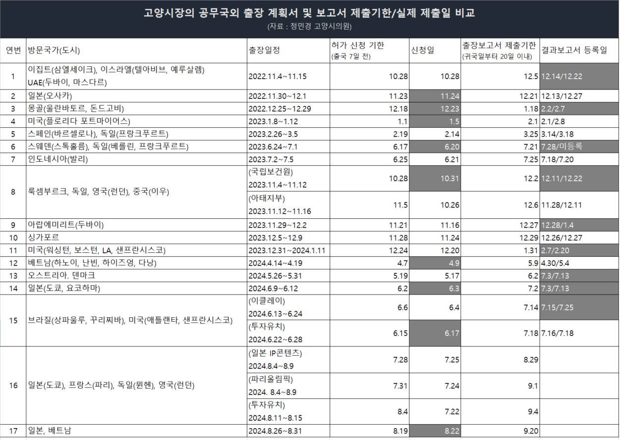 고양시 공무국외 출장 규정에 따르면, 출국 7일 이전에 공무국외 출장계획서를, 귀국일로부터 20일 이내 출장 결과보고서를 제출해야 한다. 이에 정민경 의원은 “올해 8월 30일 이전 기준으로 고양시장은 17건 해외출장을 다녀왔다. 17건 중 출국 7일 이전까지 출장계획서를 제출하지 않은 것이 9건이다. 귀국일로부터 20일 이내 출장 결과보고서를 제출하지 않은 것도 9건이다”고 지적했다. 정 의원은 “시장의 해외 일정이 굉장히 즉흥적”이라고 말했다.