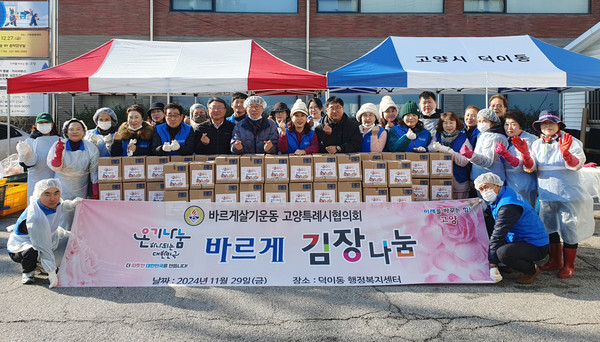 바르게살기운동 고양시협의회는 김장김치 100박스 중 35박스를 덕이동에 기부했으며, 기부된 김치는 덕이동 취약계층인 홀몸 어르신과 중장년 1인 가구 등에 직접 방문해 전달했다.