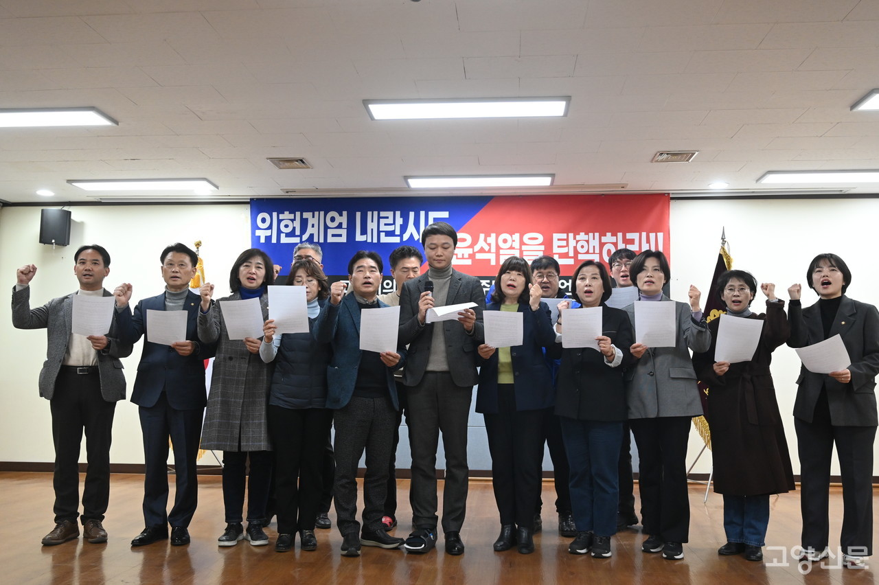 고양시의회 더불어민주당 시의원 17명(대표의원 최규진)은 4일 오후 5시 시의회 영상회의실에서 기자회견을 열고 “대한민국 헌정 질서를 파괴한 위헌 계엄선포를 강력히 규탄한다”며 성명서를 발표했다. 앞서 민주당 시의원들은 비상계엄령이 선포된 당일 국회봉쇄를 풀기 위해 현장에서 밤샘 대치를 이어간 데 이어 이날 오전에는 국회에서 열린 규탄대회에 참석하기도 했다.