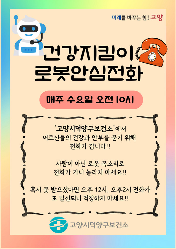 ‘건강지킴이 로봇안심전화’는 돌봄서비스가 필요한 덕양구 내 홀몸 및 노인부부 등 건강취약계층을 대상으로 운영되는 일상돌봄 모니터링 서비스로, 건강관리 취약시기인 폭염기(6~9월), 한파기(11~2월)에 500명을 대상으로 제공될 예정이다.