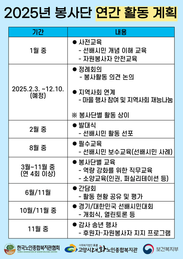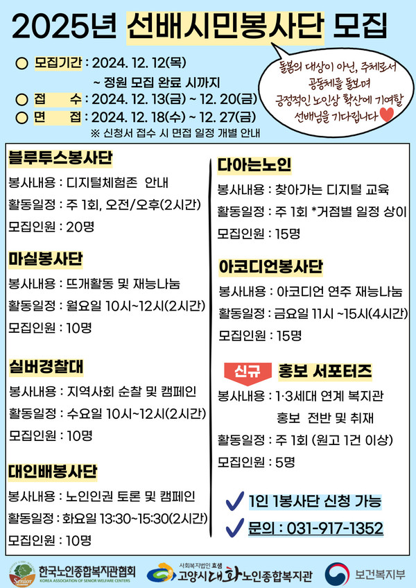 대화노인종합복지관의 한 관계자는 “선배시민봉사단은 노인이 단순히 돌봄을 받는 존재가 아니라 지역사회의 일원으로서 긍정적인 역할을 해 나가는 활동이다”라며 많은 관심과 참여를 부탁했다.