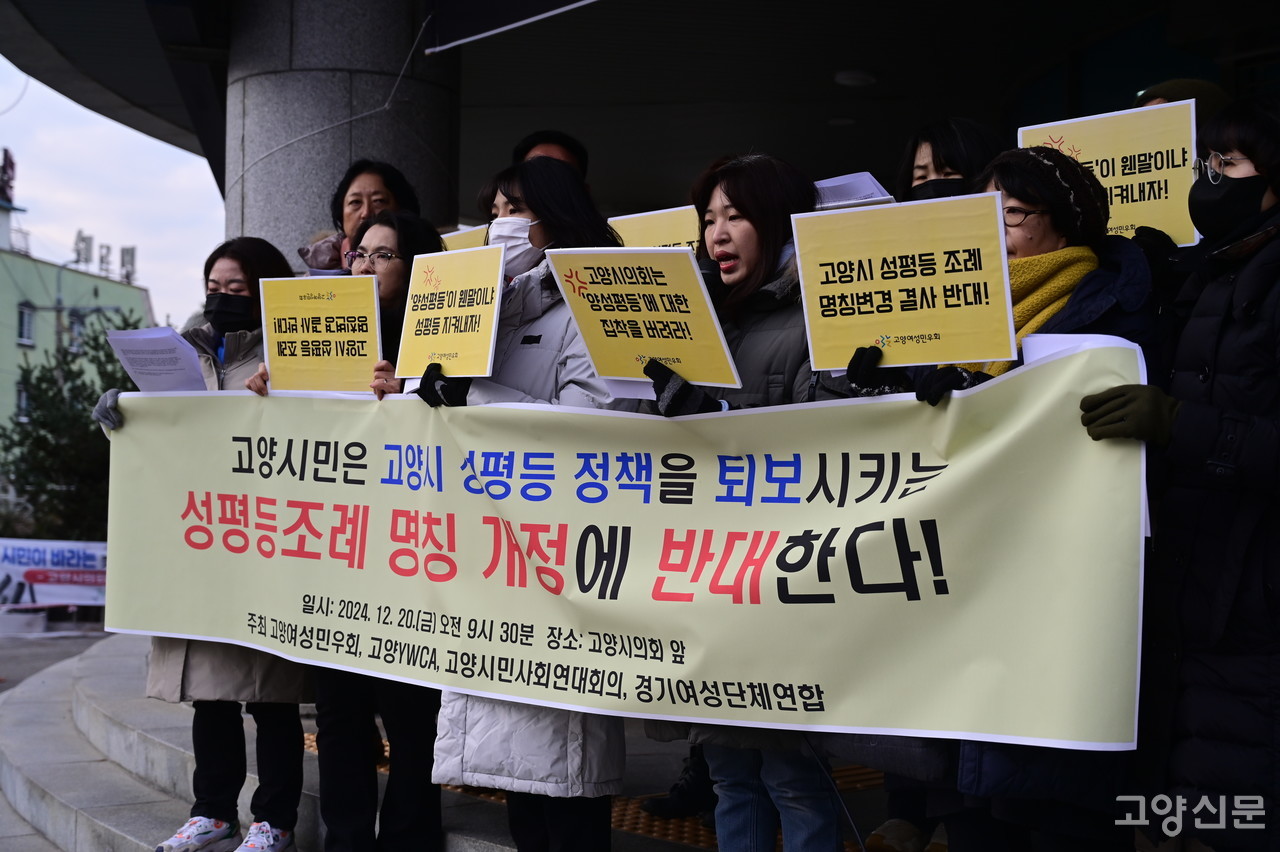 고양여성민우회와 고양YWCA, 고양시민사회연대회의, 경기여성단체연합 등은 20일 오전 9시30분 고양시의회 앞에서 기자회견을 열고 “고양시 성평등 정책을 퇴보시키는 성평등조례 명칭변경에 반대한다”는 입장을 밝혔다.