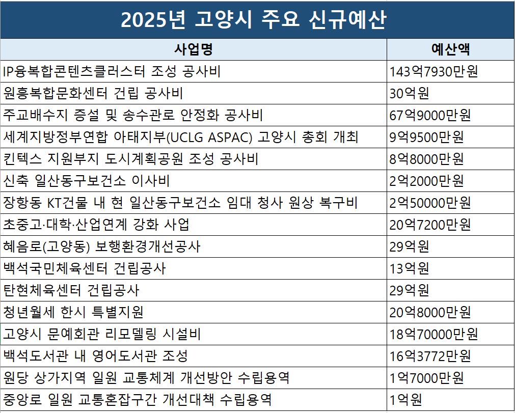 주요 신규사업을 보면 대화동에 지하1층~지상4층 규모로 조성될 ‘IP융복합콘텐츠클러스터’ 조성 공사비에 143억7930만원이 편성됐다. IP융복합콘텐츠클러스터는 유망 콘텐츠 지식재산권(IP)을 발굴·활용해 다양한 장르에서 융복합 콘텐츠 제작을 지원하는 산업 플랫폼이다. 시 미래산업과는 “2025년 2월 건축 시공사를 선정해 3월 착공을 목표로 하고 있다”고 밝혔다.