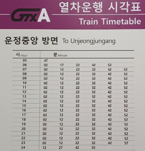 ▼킨텍스역 운정중앙역 방향 열차시간표.