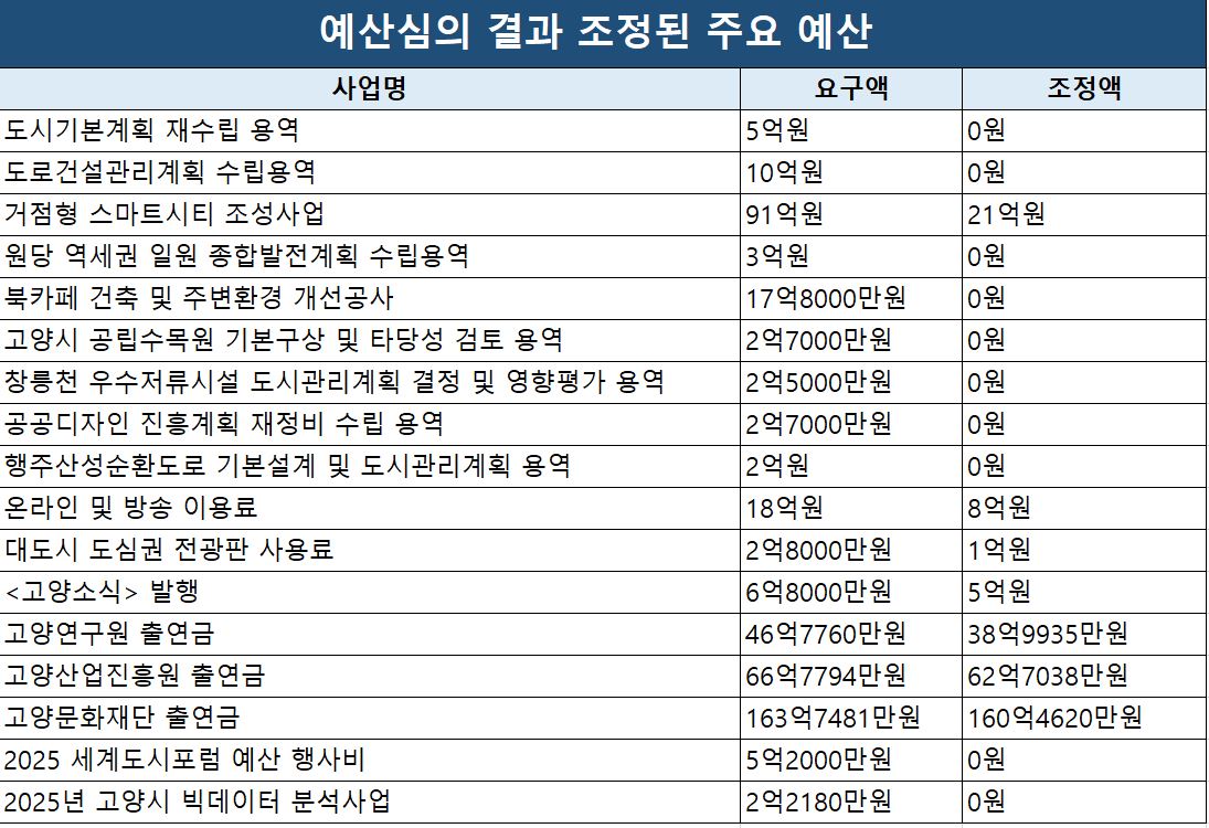 이 외에 원당역세권 일원 종합발전계획 수립 용역 3억원, 공립박물관 건립타당성 분석 용역 1억원, 공립수목원 기본구상 및 타당성 검토 용역 2억7000만원, 창릉천 우수저류시설 도시관리계획 결정 및 영향평가 용역 2억5000만원, 공공디자인 진흥계획 재정비 수립 용역 2억7000만 원, 행주산성순환도로 기본설계 및 도시관리계획 용역 2억원이 전액 삭감됐다.