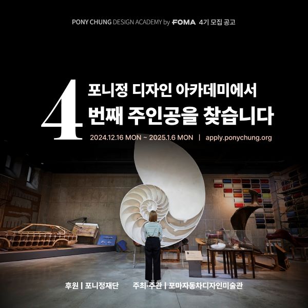 [고양신문] 덕양구 향동동에 자리한 포마자동차디자인미술관(이하 FOMA)은 포니정재단 후원으로 2025년 4기 장학생을 1월 6일까지 모집한다. FOMA(관장 박종서)와 포니정재단(이사장 정몽규)은 매년, 디자인 분야로 진출을 희망하는 20·30대 청년들을 선발해 디자인에 특화된 무료 장학교육을 운영 중이다.