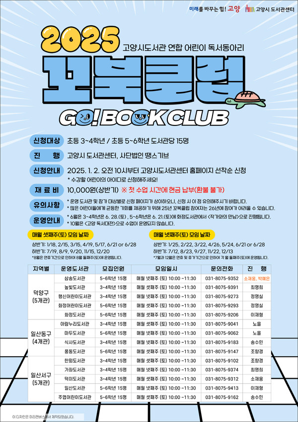 [고양신문] 고양시는 2025년 1월부터 지역 내 도서관 15개소에서 어린이 독서동아리 프로그램 ‘꼬북클럽(GO! BOOKCLUB)’을 운영한다.