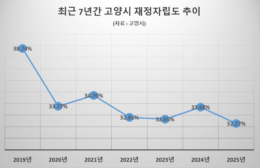 [고양신문] 2025년도 고양시의 당초예산 기준 재정자립도는 32.27%로 나타났다. 이는 2024년도 고양시의 재정자립도 33.68%보다 1.41%p 떨어진 수치다.