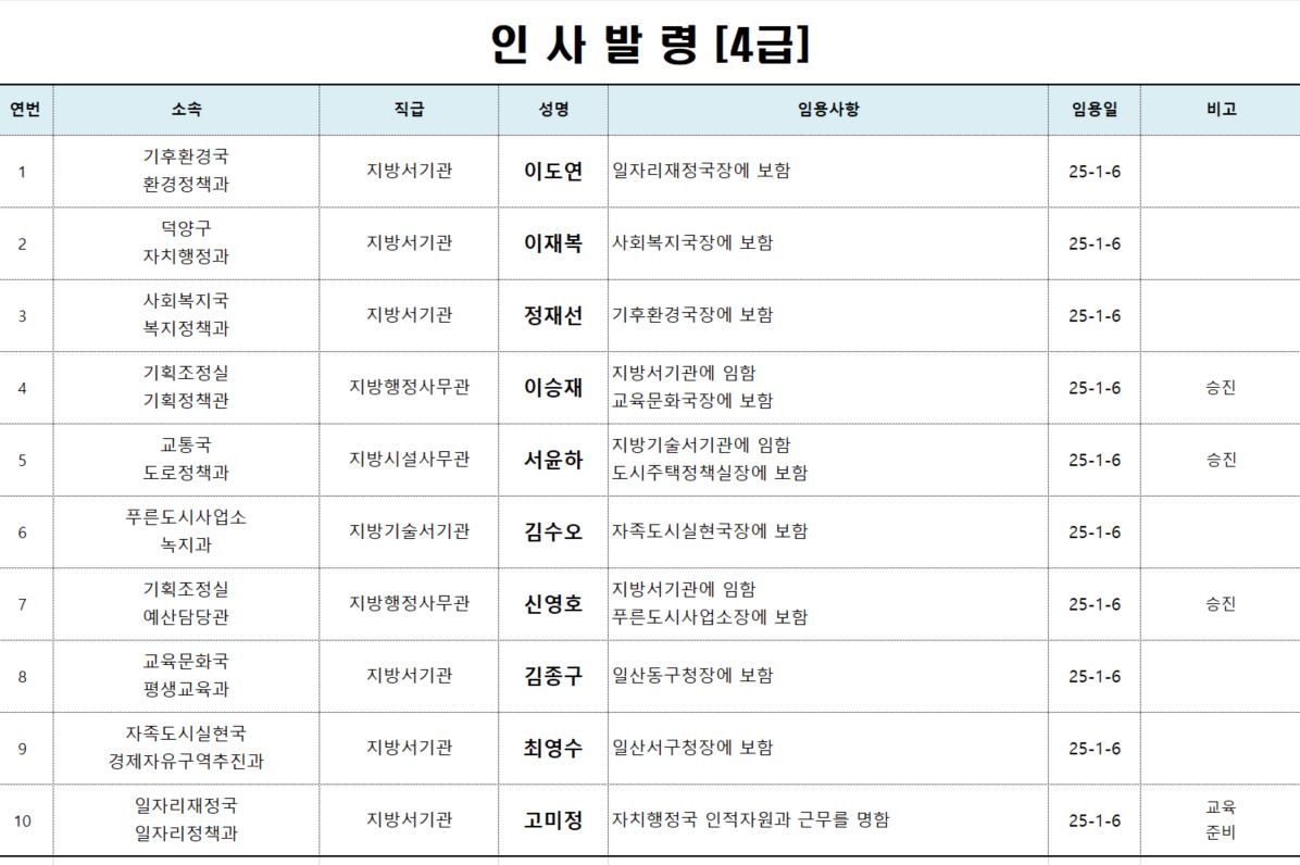 [고양신문] 고양시가 2025년도 새해 첫 인사를 단행했다. 6일자로 단행된 이번 인사는 4급 신영호, 이승재, 서윤하 3명 승진자를 포함해 9명, 5급 승진자 12명 포함 53명이 해당된다.