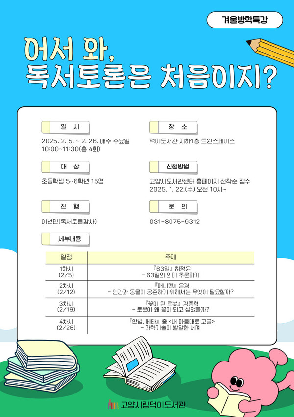 [고양신문] 덕이도서관은 겨울방학을 맞아 초등학교 5~6학년을 대상으로 오는 2월 5일부터 26일까지 매주 수요일 오전 10시, ‘어서 와, 독서토론은 처음이지?’를 총 4회에 걸쳐 운영한다.