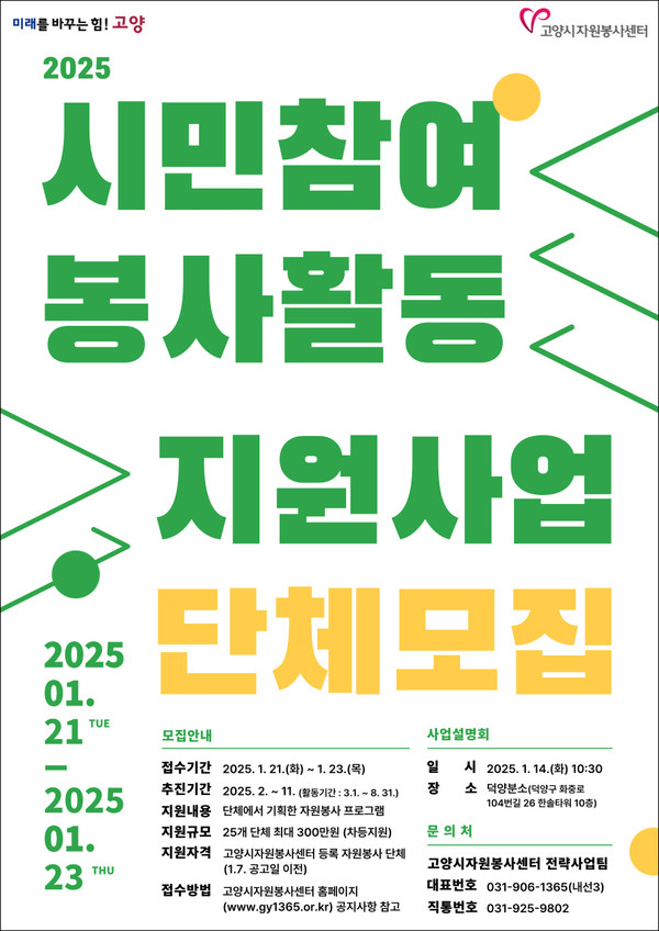 신청 기간은 1월 21일부터 23일까지 총 3일간이며, 신청서와 사업계획서 등 제출서류를 첨부해 이메일로 신청하면 된다. 제출서류는 고양시자원봉사센터 누리집(홈페이지) 공지사항에서 내려받을 수 있다.