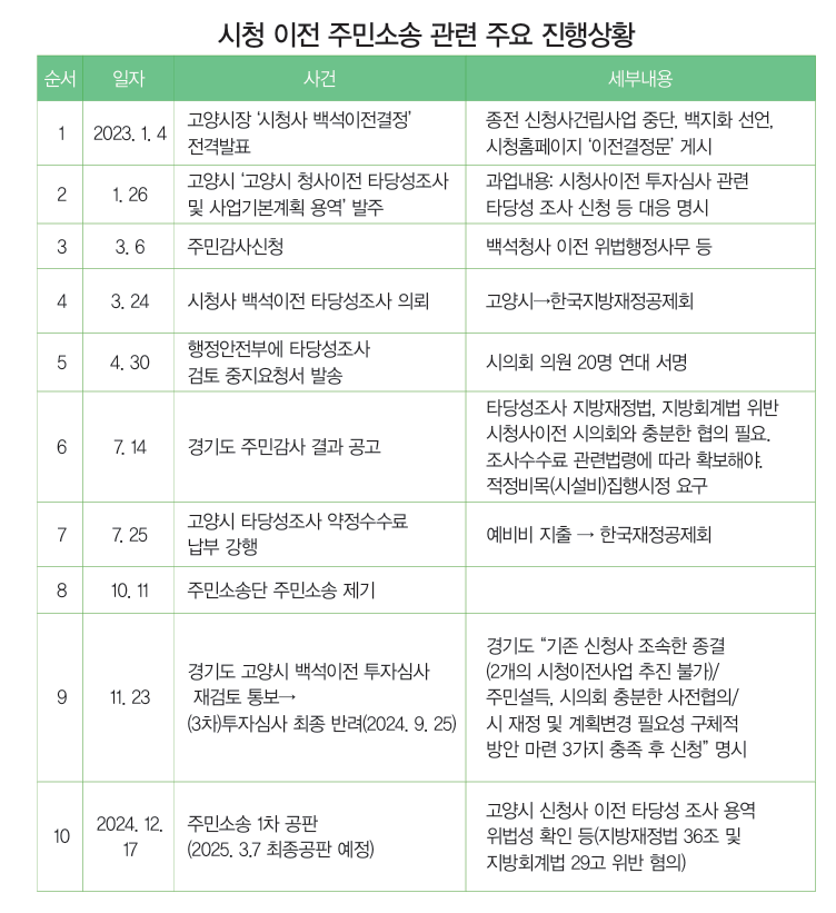 이번 주민소송의 핵심 내용은 시청사 백석 이전사업 타당성 조사 용역에서 사용된 시의 7500만원 예비비 지출 행위에 대한 위법성 여부다. 앞서 2년 전 주민소송단은 고양시의 시청 이전사업이 위법행정사무라고 주장하며 경기도에 주민감사를 청구한 바 있다. 이에 경기도는 감사 결과 고양시의 타당성 조사 용역계약이 지방재정법 및 지방회계법 위반한 것으로 결론 내렸으나 고양시는 감사결과에 반발하며 같은 해 9월 헌법재판소에 권한쟁의 심판 및 가처분 신청을 제출했고, 반면 주민소송단은 고양시가 감사결과를 받아들이지 않고 있다며 의정부지방법원에 시청사 이전 위법사무건에 대한 주민소송을 제기했다<1637호 '시청 이전 타당성 용역 예비비 논란, 법정 가나' 참조>.