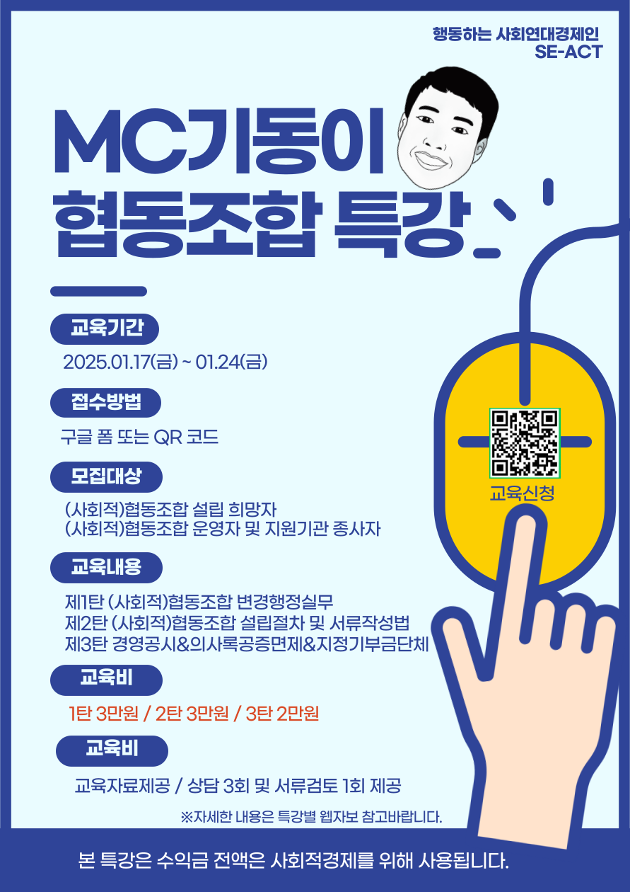 ‘행동하는 사회연대경제 SE-ACT’(이하 SE-ACT)는 오는 17일부터 (사회적)협동조합 설립절차와 서류작성법, 변경행정, 경영공시 등 실무 전반에 관한 온라인 특강을 진행한다. 모집 대상은 (사회적)협동조합 설립 희망자뿐만 아니라 기존 (사회적)협동조합 운영자와 지원기관 종사자 등이며 전 서울시 협동조합지원센터 상담지원팀장을 지낸 이기대 SE-ACT 공동추진위원장이 강사로 참여한다.