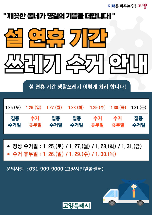 고양시 관계자는 “설 연휴 기간 중 1월 26일, 29일, 30일 3일은 근로자 휴무로 쓰레기를 수거하지 않으므로 수거가 가능한 전날 일몰 이후에 쓰레기를 배출해 주기를 바란다. 설 연휴 전후 생활쓰레기 수거에 최선을 다할 계획으로 각 가정에서도 낭비되는 음식물 최소화, 재활용품 분리배출 철저 등 생활쓰레기 감량을 위해 적극적인 협조를 당부한다”라고 전했다.