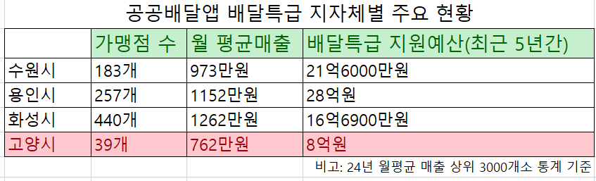 하지만 타 지자체의 공공배달앱 확대 흐름과 달리 고양시는 100만 인구가 넘는 특례시임에도 가맹점 수와 매출 규모에서 도내 꼴찌수준을 면치 못하는 실정이다. 해당 매출통계자료를 세부적으로 살펴보면 고양시 가맹점 수는 39개에 불과하며 총 매출액 또한 3억원에도 미치지 못하는 것으로 나타났다. 이는 같은 특례시인 수원시(가맹점 183곳, 매출 17억8000만원)와 용인시(가맹점 257곳, 매출 29억6000만원)에 비해 턱없이 낮은 수준이며 인근 파주시(가맹점 203곳, 23억8800만원)에 비교해도 큰 차이를 나타냈다.