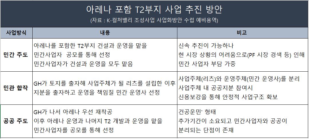 이마저도 실패할 경우 경기주택도시공사(GH)가 전면에 나서 아레나를 직접 건설한 다음 아레나와 T2부지에 대한 운영권은 공모를 통해 민간 사업자에게 맡기는 방식을 대안으로 제시했다. 바로 경기도가 당초 제시했던 ‘건공운민’(건설은 공공, 운영은 민간이 맡음) 방식이다. 이 역시 아레나 착공은 민간주도방식보다 최소 8개월 이상 늦춰진다. 이럴 경우 이미 지난해 7월 착공한 창동 서울 아레나 등 주변 아레나와의 경쟁적 우위를 놓치게 된다.