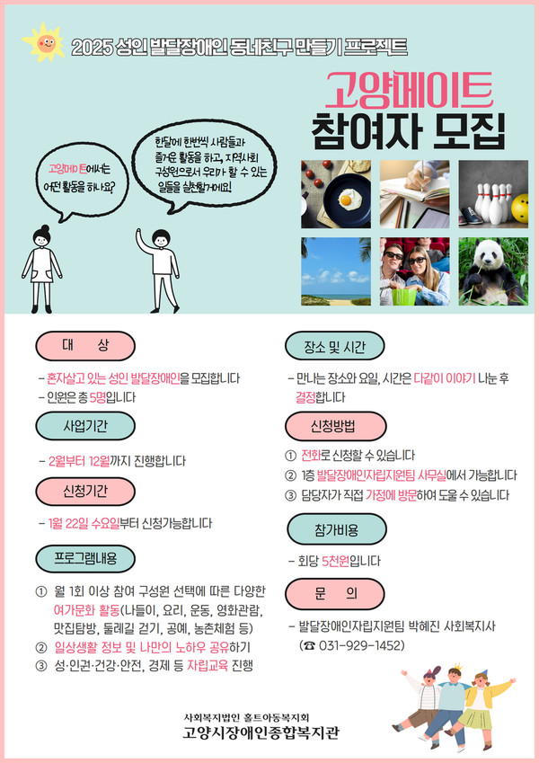 프로그램에 대한 자세한 내용은 고양시장애인종합복지관 홈페이지의 ‘알림공간-공지사항’ 게시물에서 확인할 수 있으며, 문의는 발달장애인자립지원팀(031-929-1452)으로 하면 된다.