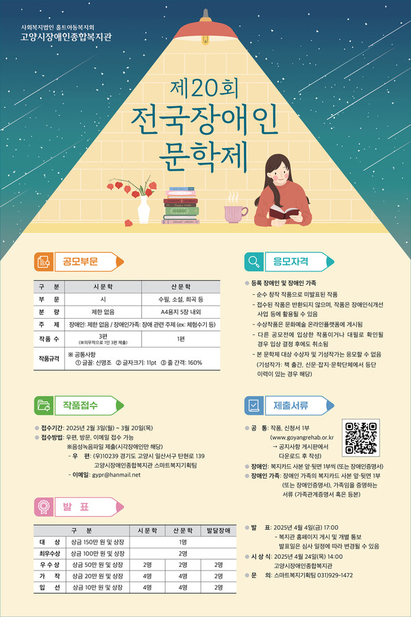 [고양신문] 고양시장애인종합복지관(운영법인 홀트아동복지회)이 진행하는 제20회 전국장애인문학제(이하 문학제) 작품접수가 오는 2월 3일부터 시작된다. 이번 문학제에는 전국의 장애인과 가족이 응모할 수 있으며, 공모분야는 시문학과 산문학으로 우편, 이메일, 방문으로 접수가 가능하다.