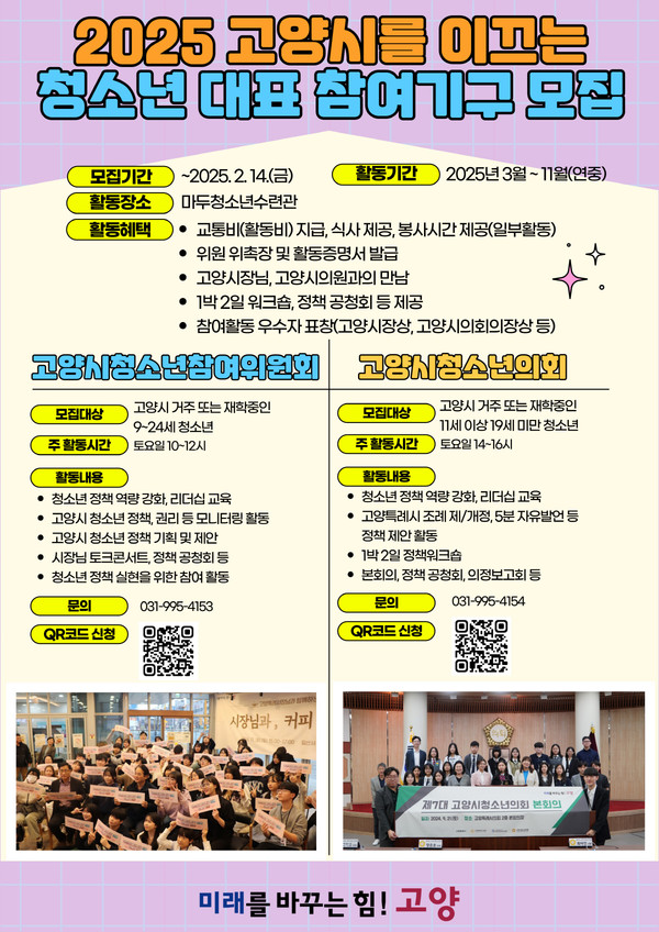 최회재 고양시청소년재단 대표이사는 “청소년참여위원회와 청소년의회는 청소년들이 자신의 의견을 자유롭게 표현하고 정책 과정에 실질적으로 기여할 수 있는 중요한 기회다. 많은 청소년들이 참여해 주체적으로 성장할 수 있도록 관심과 지원을 부탁드린다”라고 전했다.