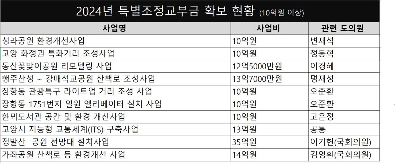 이 외에도 △동산꽃맞이공원 리모델링 사업 12억50000만원 △고양 화정권 특화거리 조성사업 10억원 △장항동 1751번지 일원 엘리베이터 설치사업 10억원 △한뫼도서관 공간 및 환경개선사업 10억원 △고양시 지능형 교통체계(ITS) 구축사업 20억원 △가좌공원 산책로 등 환경개선사업 10억원의 특조금이 사용된다.