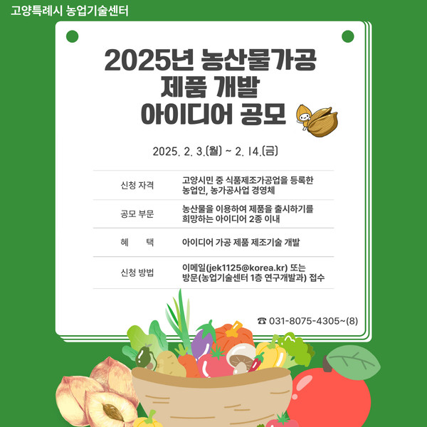 더 자세한 사항은 고양시농업기술센터 누리집 공지사항을 확인하거나 가공기술팀(031-8075-4305~6)으로 문의하면 된다.