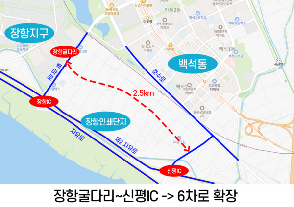 장항지구에서 장항1동으로 이어지는 장항로(시도57호선)와 일산신도시에서 장항IC로 이어지는 백마로가 교차하는 ‘장항 굴다리 교차로’는 2차로였던 도로폭을 6차로로 확장하는 개선 공사를 지난해 12월 마무리했다. 추가 과제는 장항 굴다리 교차로부터 신평IC 연결도로까지 이어지는 장항로 2.5㎞구간을 기존 왕복 2차로에서 왕복 6차로로 확장하는 공사다.