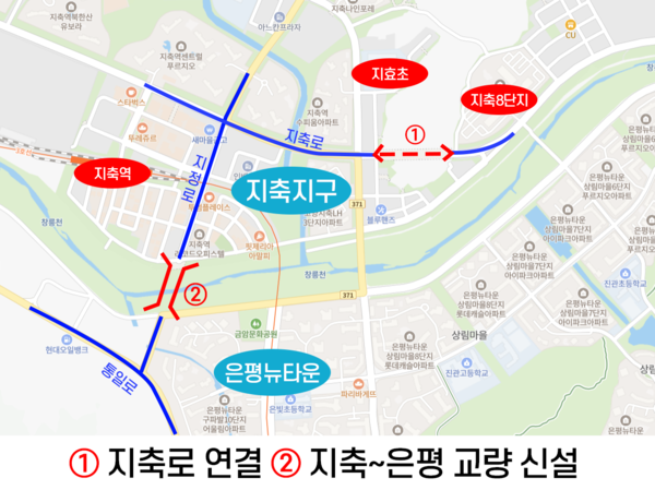 지축지구를 종(남~북)으로 가로지르는 지방도371호선 은평뉴타운 10단지를 연결하는 교량도 올해 안에 착공을 앞두고 있다. 양주시와 지축동을 연결하는 지방도371호선(일영로)은 지축지구로 들어오며 ‘지정로’로 이어지는데, 현재는 안진로 단독택지지구에서 창릉천에 가로막혀있다. 새로 완공될 교량을 이용하면 지축지구에서 통일로로 곧바로 진입할 수 있게 된다.