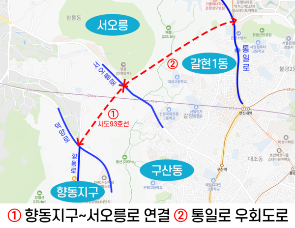 삼송지축향동지구 광역교통개선 대책의 일환으로 추진 중인 ‘시도93호선 도로개설공사’는 지난해 12월 공사 시행 허가가 완료돼 2027년 12월 준공을 목표로 공사가 진행 중이다. 신설 도로가 뚫리면 향동지구 북쪽 덕양로에서 서오릉 남쪽 서오릉로까지 1.1㎞가 직결된다. 이곳은 봉산(209m)이 고양시 덕양구 향동·용두동과 서울시 은평구 구산동의 경계를 이루고 있는 곳이라, 해당 도로는 터널로 시공되고 있다.