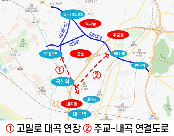 계획 중인 두 개의 노선은 상호 연계성을 지닌다. 하나씩 살펴보면 ‘고일로~대곡 연장노선’은 현재 식사동 동국대병원 앞 고양대로에서 출발해 풍동지구를 지나 강촌로지하차도 인근까지 연결되어있는 고일로를 내곡동 대곡초등학교 인근까지 약 2.5㎞ 연장하는 도로다. 도로가 개통되면 장기적으로 현재 도로교통 인프라가 절대 부족한 대곡역 인근의 교통여건이 다소 개선될 것으로 보인다.