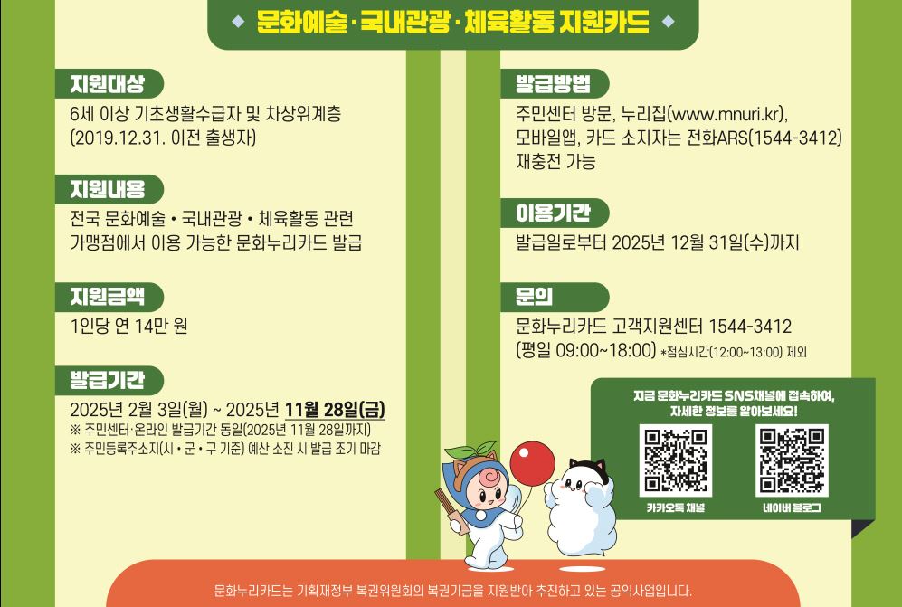 시 관계자는 “문화누리카드 예산 소진 시 문화누리카드 발급이 어려우므로 빠른 신청을 권장드린다”며, “문화누리카드 지원 금액이 올해 1만원 증액된 만큼 적극적인 사용을 통해 문화생활의 즐거움을 누리시기 바란다”라고 밝혔다.