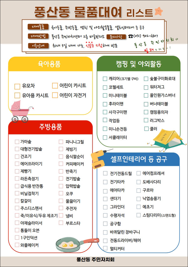 대여 물품 등 자세한 내용은 고양시청 누리집 내 풍산동 페이지 또는 주민자치센터 전단지에서 확인할 수 있다. 풍산동 마을관리소(031-902-6807)로 문의해도 된다.