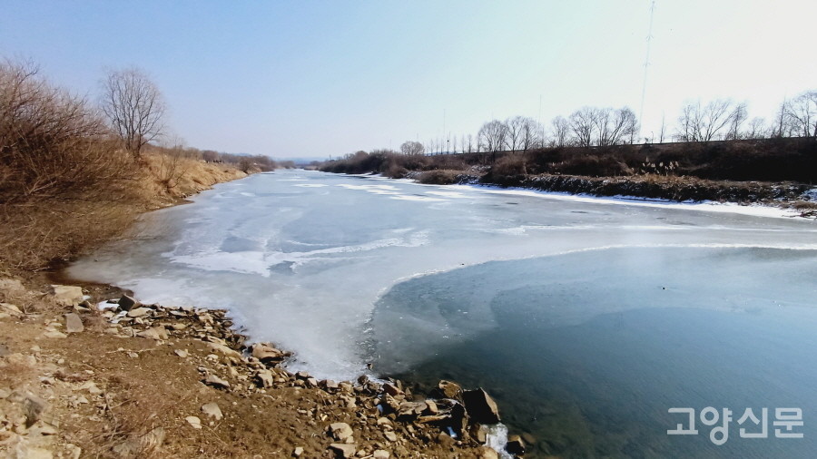 북한산 계곡에서 발원해 덕양구의 여러 마을을 지나온 창릉천이 한강과 만날 준비를 하는, 바로 옆 둔치에서 봄에는 유채꽃, 가을에는 코스모스 축제가 열리는 곳이다. 물이 깊고 흐름이 잔잔한 곳은 다 얼어있고, 하천 하구 쪽은 결빙 구간과 유수 구간이 번갈아 나타난다. 얼음판 곳곳에 산책 나온 이들이 돌멩이를 던진 흔적들이 눈에 띈다.