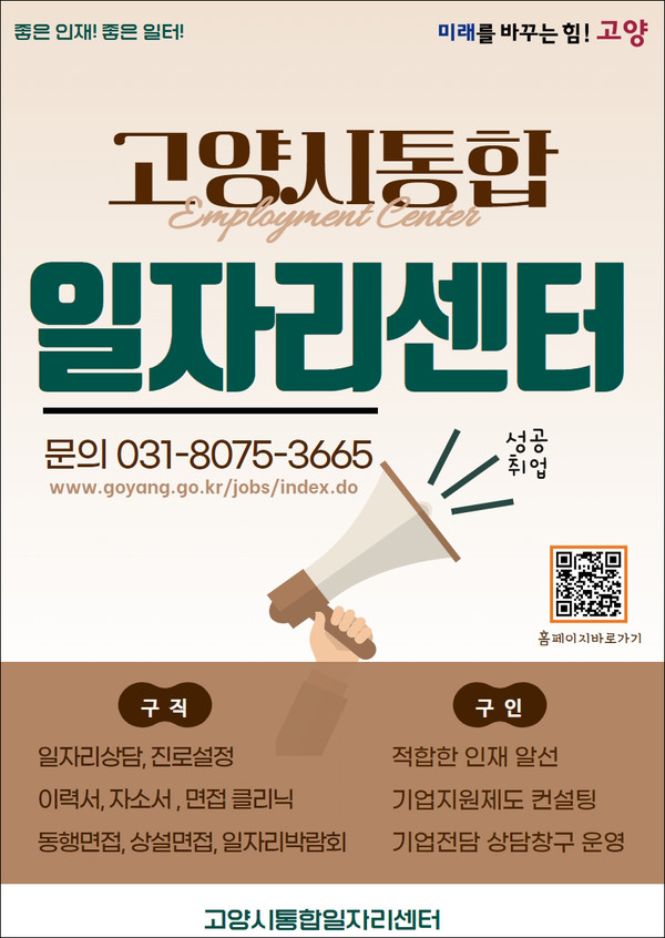 일자리 상담과 각종 지원프로그램 운영 등 자세한 내용은 고양시 일자리통합누리집(www.goyang.go.kr/jobs) 및 블로그(blog.naver.com/goyang_jobs) 또는 대표전화(031-8075-3665)로 문의하면 된다.