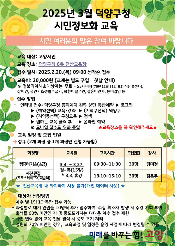 이번 교육은 3월 4일부터 27일까지 주 4일(월~목) 덕양구청 6층 전산교육장에서 열린다. 교육 과정은 ▲컴퓨터 기초(초급) ▲사진 편집 과정으로 구성돼 있다.