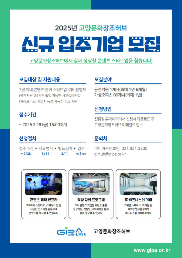 신청은 2월 28일 오후 3시까지 고양문화창조허브 이메일(g-hub@gipa.or.kr)로 접수하면 된다. 평가를 거쳐 3월 중 최종 기업을 선정한 후 4월부터 입주가 진행된다. 자세한 내용은 고양산업진흥원 누리집에서 확인할 수 있다.