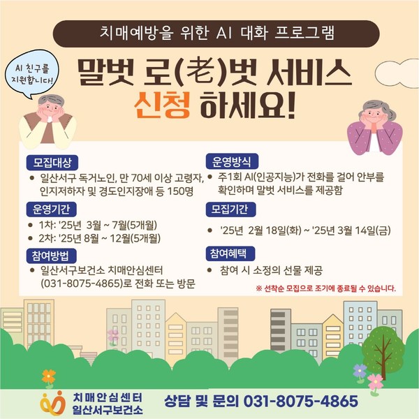 [고양신문] 일산서구보건소가 3월 14일까지 인공지능(AI)을 활용한 ‘AI 말벗 로(老)벗 서비스’에 참여할 1차 대상자를 모집한다.
