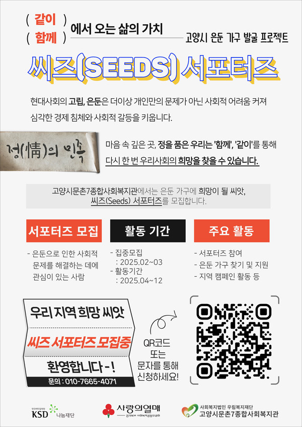 더불어 고양시 은둔형 청·중장년들에게 든든한 지원군이 되어줄 서포터즈 '씨즈(seeds)'를 모집 중으로 활동에 참여하고 싶은 고양시민은 고양시문촌7종합사회복지관(031-916-4071)으로 문의하면 된다.