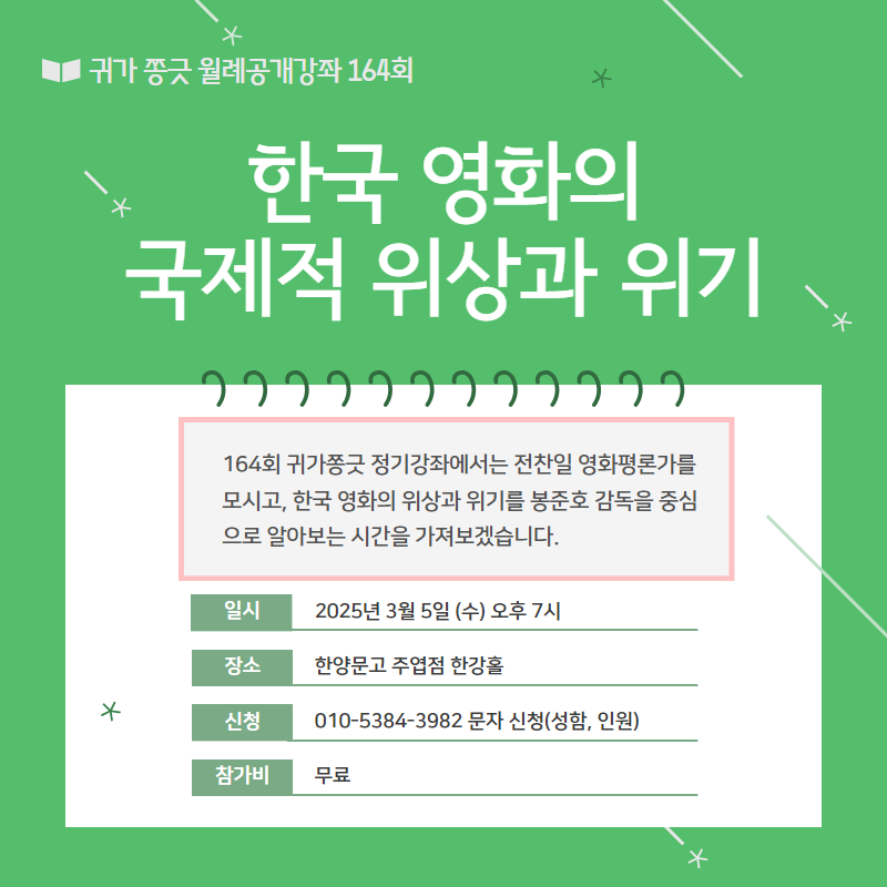 3월 5일 저녁 7시에 열릴 귀가쫑긋 164회 월례강좌는 ‘한국 영화의 국제적 위상과 위기’라는 주제로 전찬일 영화평론가 강연할 예정이다. 장소는 한양문고. (예약 : 010-5384-3982)