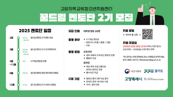 모집 기간은 2월 26일까지로, 지원 희망자는 고양시학교밖청소년지원센터 공식 누리집을 신청할 수 있다. 이후 3월 4일, 멘토단 2기 오리엔테이션이 진행될 예정이다.