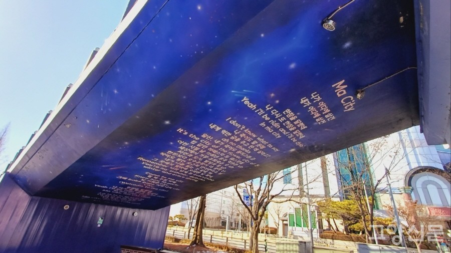 또한 2015년 BTS가 발표한 ‘마이 시티(MA CITY)’라는 곡에서도 RM은 고향 일산에 대한 어마어마한 자부심과 사랑을 노래하기도 했는데, 그 가사는 정발산과 일산문화광장을 연결하는 육교 아래쪽에 적혀있다. 가사를 잠시 들어보자.