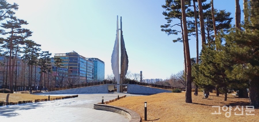 앞선 기사에서 떡꼬치탑으로 불리는 ‘바람곶’ 조형물이 일산문화광장의 시그니처라고 말했지만, 이제 그 자리는 새로운 공공조형물이 넘겨받고 있는 느낌이다. 광장 전체를 찍은 사진들을 고르다 보면 어김없이 시각적 존재감을 발휘하는 거대한 조형물, 바로 ‘고양 독립운동기념탑’이다. 3·1독립운동을 상징하는 31m 높이로 솟아있는 이 탑은 수평적으로도 좌우 40m, 앞뒤 140m의 드넓은 공간을 자신의 영향권으로 점하고 있다.