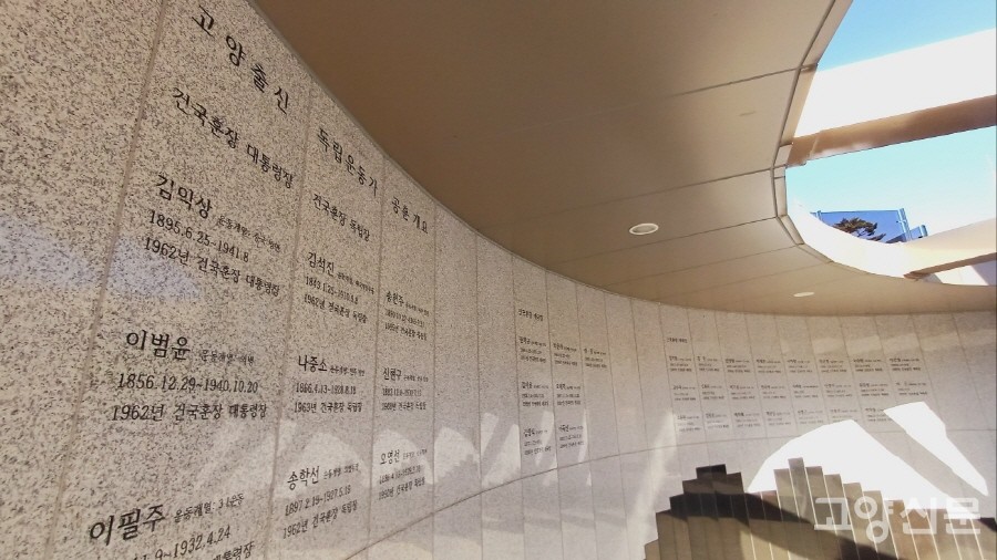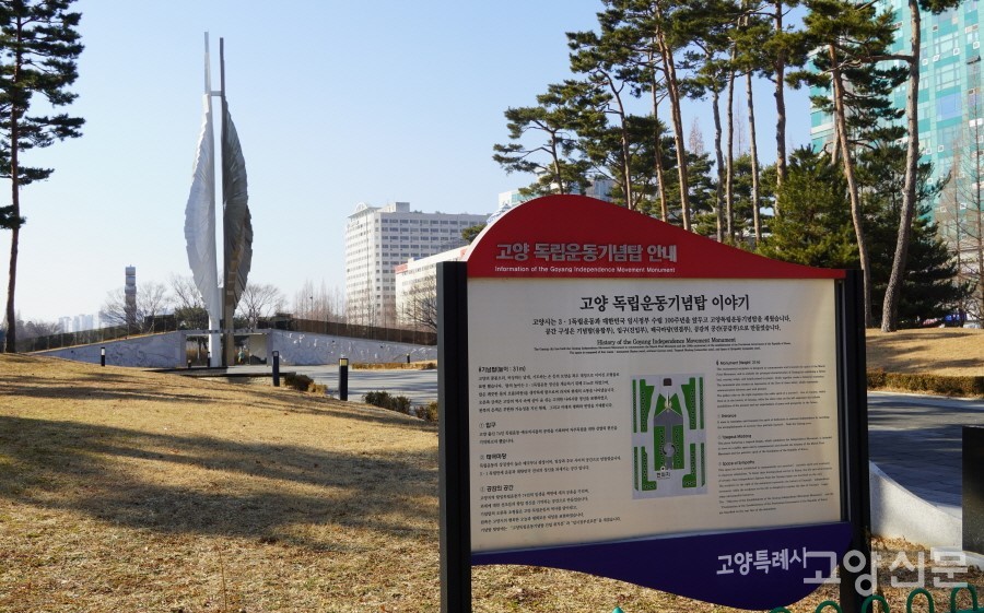3·1독립운동 100주년을 1년 앞둔 2018년 광복회 고양시지회와 고양시가 함께 세운 이 탑은 ‘고양출신 독립운동 유공자들의 공적을 기록하며 조국과 고양을 위한 님들의 희생과 헌신을 오래도록 기억하기 위해 건립했다’고 취지를 밝히고 있다. 탑의 형상은 꽃봉오리와 비상하는 날개와 기도하는 손 등을 좌우 대칭으로 이었다고 설명해 놓았는데, 바꿔 말하면 ‘무슨 형상인지 직관적으로 다가오지 않는다’는 말로 들린다.