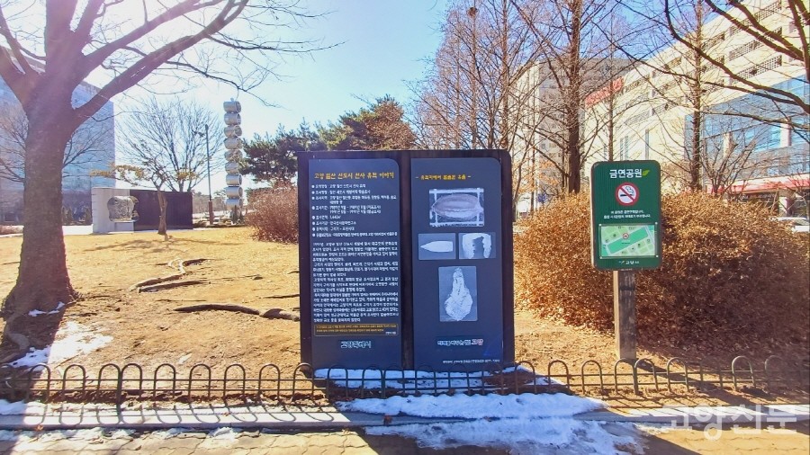 최성 시장 이후 들어선 3개의 공공조형물도 살펴보자. 2019년에는 6·25전사자 명비 인근에 ‘고양 일산신도시 선사유적 이야기’ 안내간판이 세워졌다. 1990년대 초 일산신도시 개발에 앞서 진행된 유물조사에서 고양가와지볍씨를 비롯해 선사시대의 유물들이 출토된 사실을 사진과 함께 소개하고 있다. 고양시가 30년 전에 만들어진 신도시가 전부가 아니라, 먼 옛날 구석기 시절부터 사람들이 살았던 역사가 깊은 고장이라는 점을 강조하고 있다.