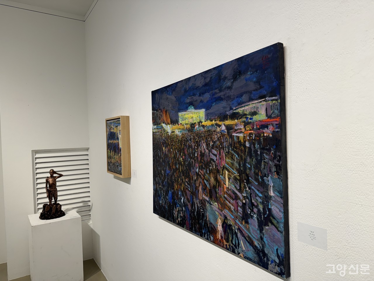 1일 고양 어울림누리 어울림미술관에서 광복 80주년 기념 전시회 <3.1 운동에서 빛의 혁명으로> 개막행사가 열렸다. 고양시민회와 민족문제연구소 고양파주지부가 주최 이번 전시회는 고경일, 김사리, 김서경, 김수빈, 김영미, 김운성, 김화순, 레오다브, 민정진, 박서연, 박성완, 백영욱, 이구영, 이정헌, 이하, 임대니, 조아진, 황은관 18명의 작가가 함께 했다. 전시 참가 작가들은 ‘역사를 기록하는 작가모임’ 소속으로 앞서 지난 2023년에는 관동대지진 조선인 학살 100주년을 맞아 일본작가들과 연대하는 작업을 진행했다.