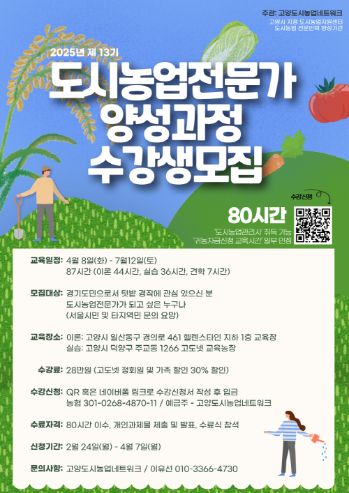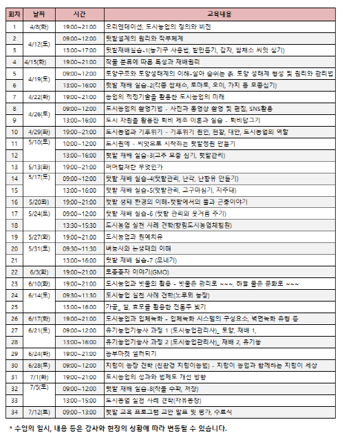 교육일정은 4월 8일부터 7월 12일까지 87시간 과정으로 짜여졌고, 이론교육과 현장실습·견학이 반반씩 진행된다. 전체 일정 중 80시간 이상을 이수하고, 개인과제물 제출과 발표에 성실히 참여하면 수료증이 주어지고, 도시농업관리사 자격증을 취득할 수 있다. 경기도민으로서 텃밭 경작에 관심 있는 초보자, 또는 도시농업전문가가 되고 싶은 유경험자 모두 신청할 수 있고, 수강료는 28만원이다.