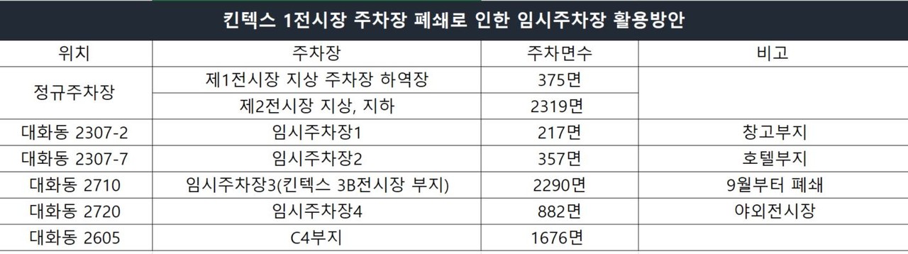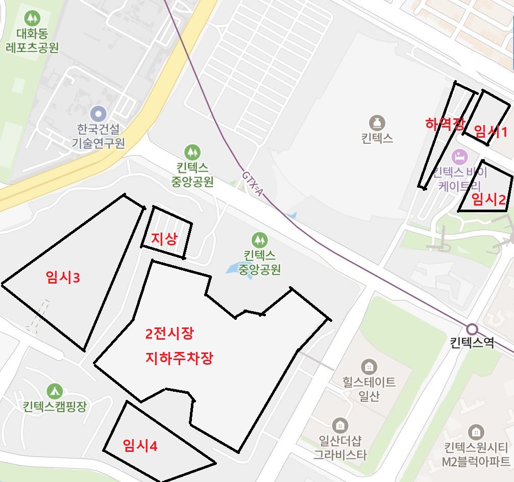 고양시와 ㈜킨텍스는 우선 기존 1전시장 주차장부지의 1943면(일반 1568대·하역 375대)을 대체할 수 있는 주차공간으로 킨텍스 주변 시유지를 최대한 활용한다는 계획이다. 고양시와 ㈜킨텍스는 지난 2023년 10월 킨텍스 제3전시장 착공으로 인해 주차 공간 부족을 사전에 예방하기 위해 킨텍스 인근 시유지를 임시 주차장 부지로 활용할 수 있도록 협조한다는 협약을 맺었다.