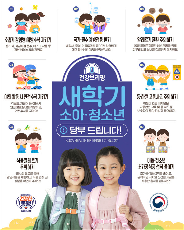 새학기가 시작되면 학교나 어린이집, 학원 등에서 집단생활이 증가함에 따라 감염병과 안전사고 발생 위험이 커질 수 있다. 이에 보건소는 호흡기 감염병, 알레르기 질환, 교통사고 등 예방을 위한 7가지 필수 건강 수칙을 지켜줄 것을 당부했다.