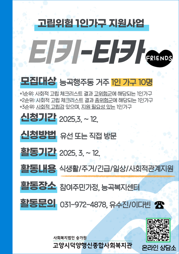 해당 지역의 복지 상담이 필요한 주민은 고양시덕양행신종합사회복지관 별관 능곡복지센터에 전화(031-972-4878), 홍보지 내 QR코드를 통해 신청할 수 있다.